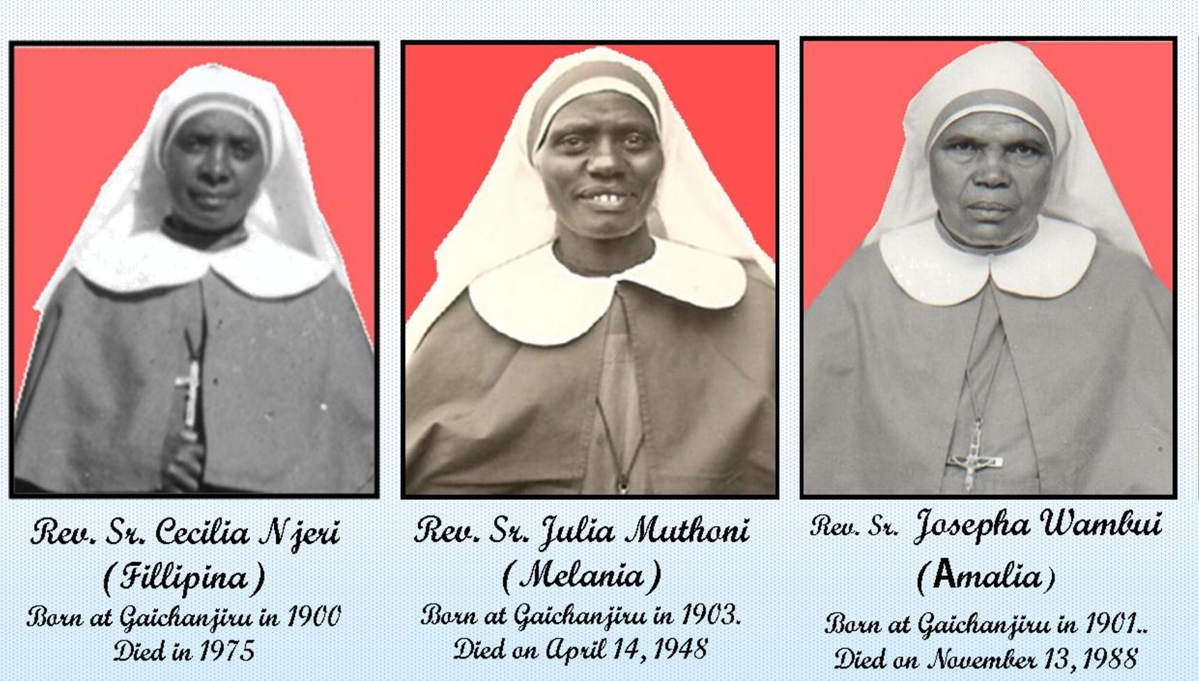 They were founded by Rt. Rev. Filippo Perlo, I.M.C. (a Consolata missionary Bishop) together with three Kenyan pioneer sisters: Sr. Filippina Njeri,Sr. Julia Muthoni, and Sr. Josepha Wambui.